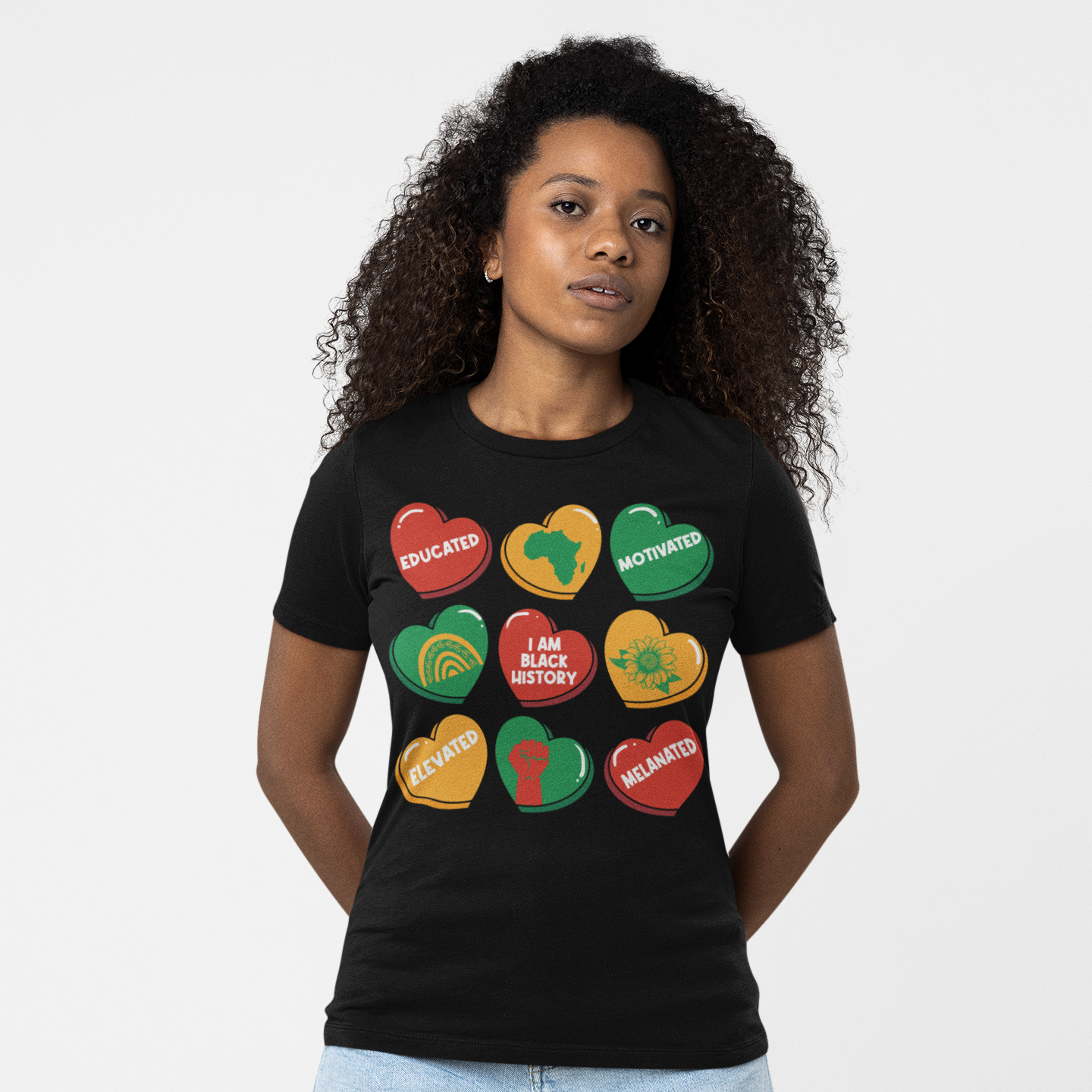 This premium t-shirt features a colorful grid of nine hearts, each containing inspirational sayings and affirmations about Black history, culture, and pride. A vibrant, uplifting design that celebrates the beauty and strength of the Black community.