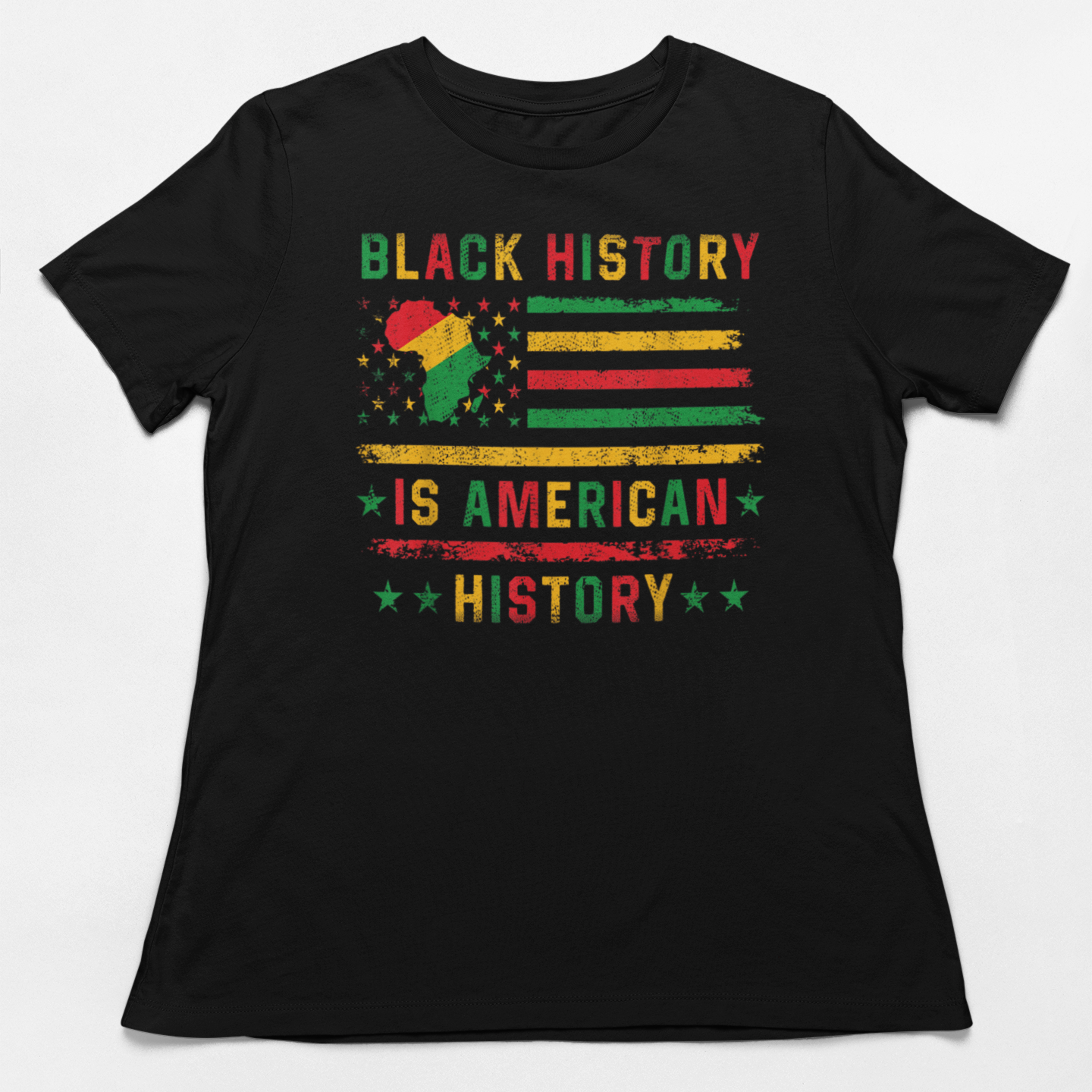 This premium t-shirt features an American flag design with Pan-African colors, Africa map, distressed vintage aesthetic, and stars surrounding the continent. A bold visual reminder that Black history is not separate from American history—it IS American history.