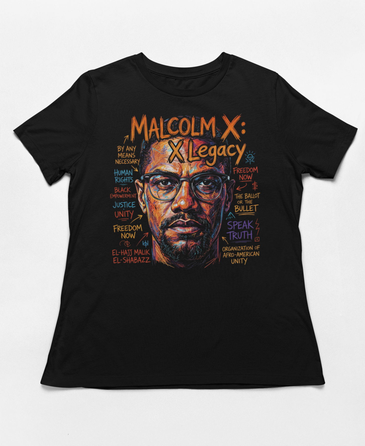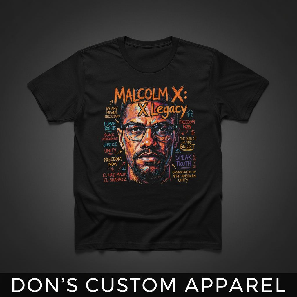Honor the powerful legacy of Malcolm X with this striking Black History Month t-shirt. This premium design celebrates the influential civil rights leader with vibrant artwork and inspiring quotes about empowerment, justice, and the fight for freedom by any means necessary.