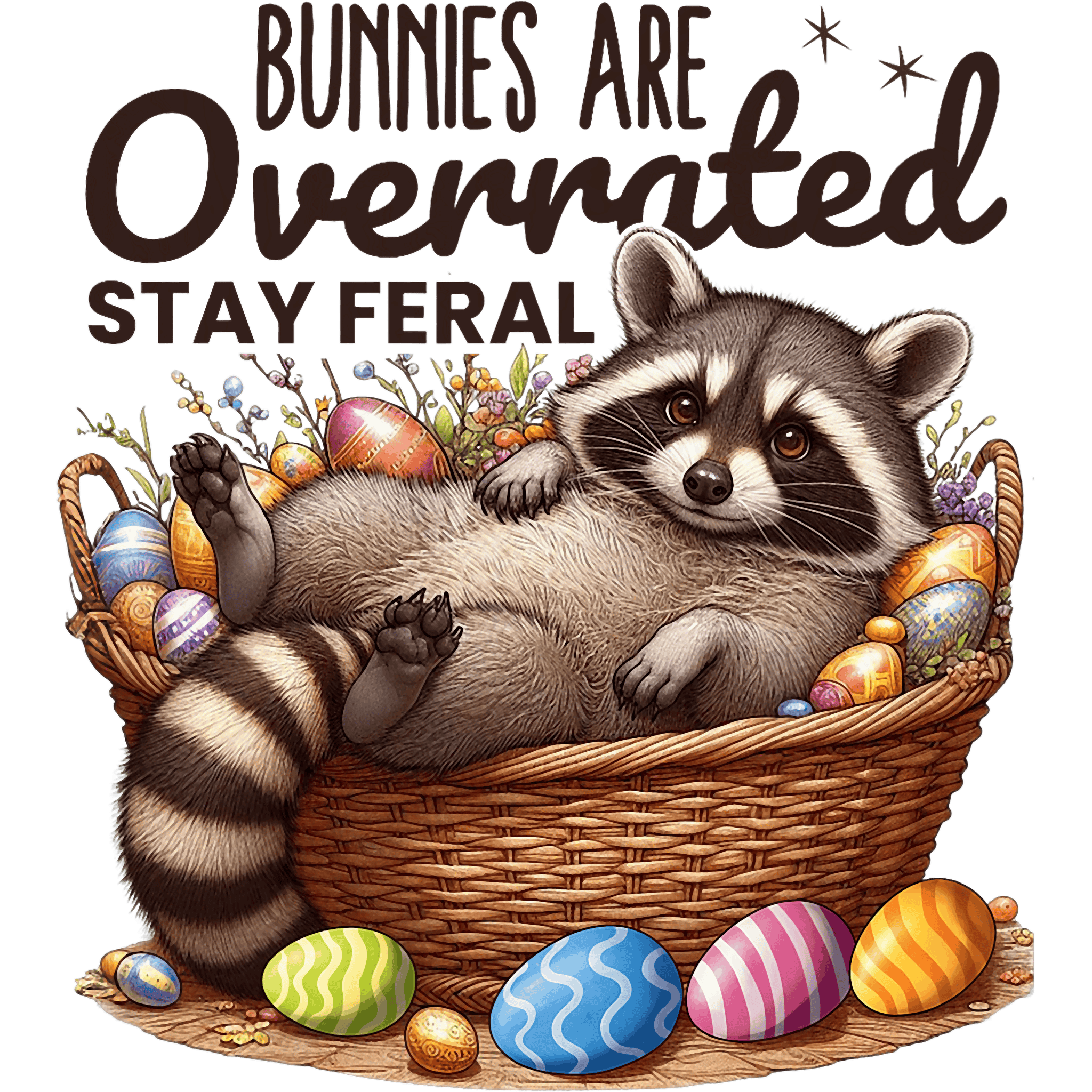 Adorably feral — the Cute Raccoon Tee features a sweet raccoon rocking bunny ears and holding a basket of Easter eggs with a bold pink "Stay Feral" message. Perfect for women and girls who keep it real.
