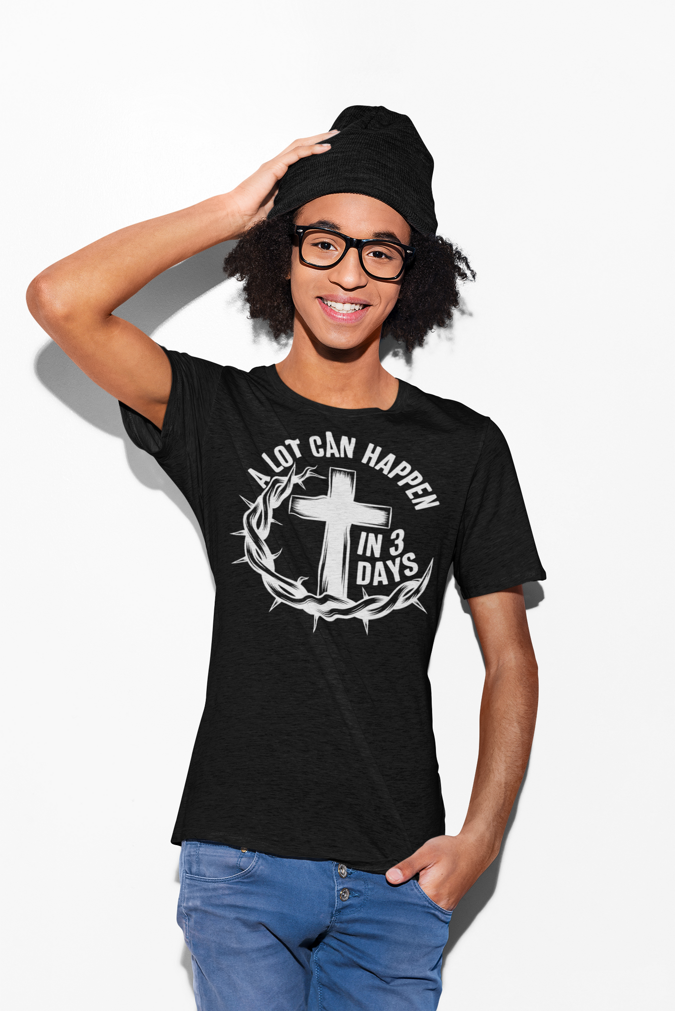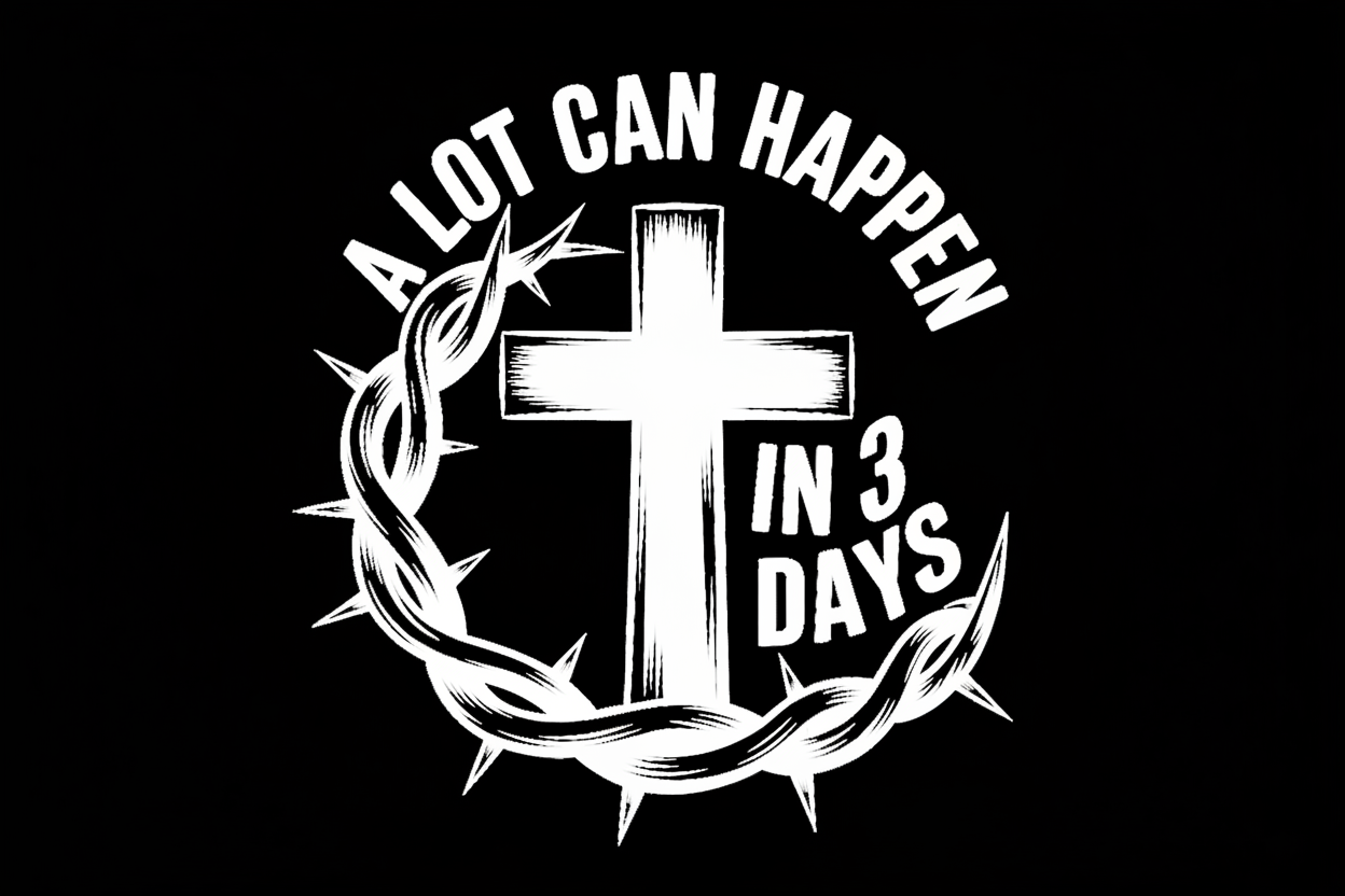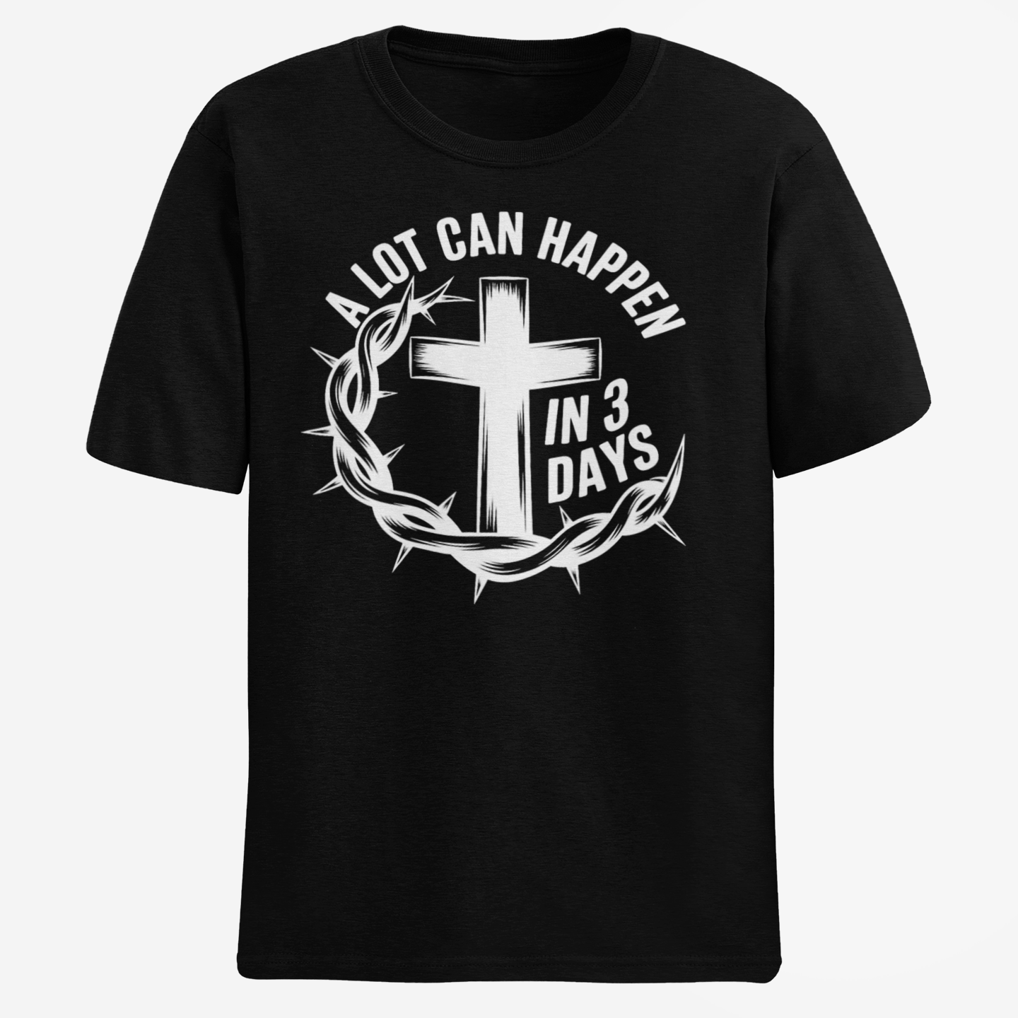 In 3 Days, everything changed — the In 3 Days Tee features our signature white logo graphic on a premium black tee. Bold, clean, and faith-forward. Available in black only.
