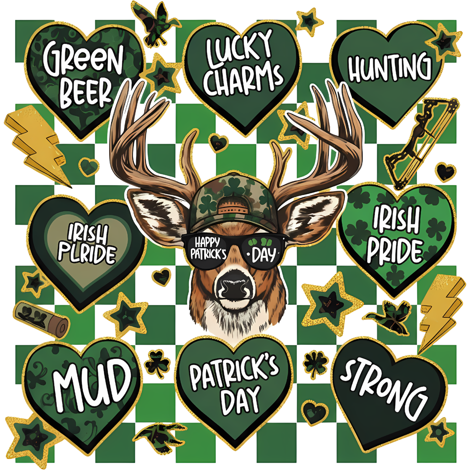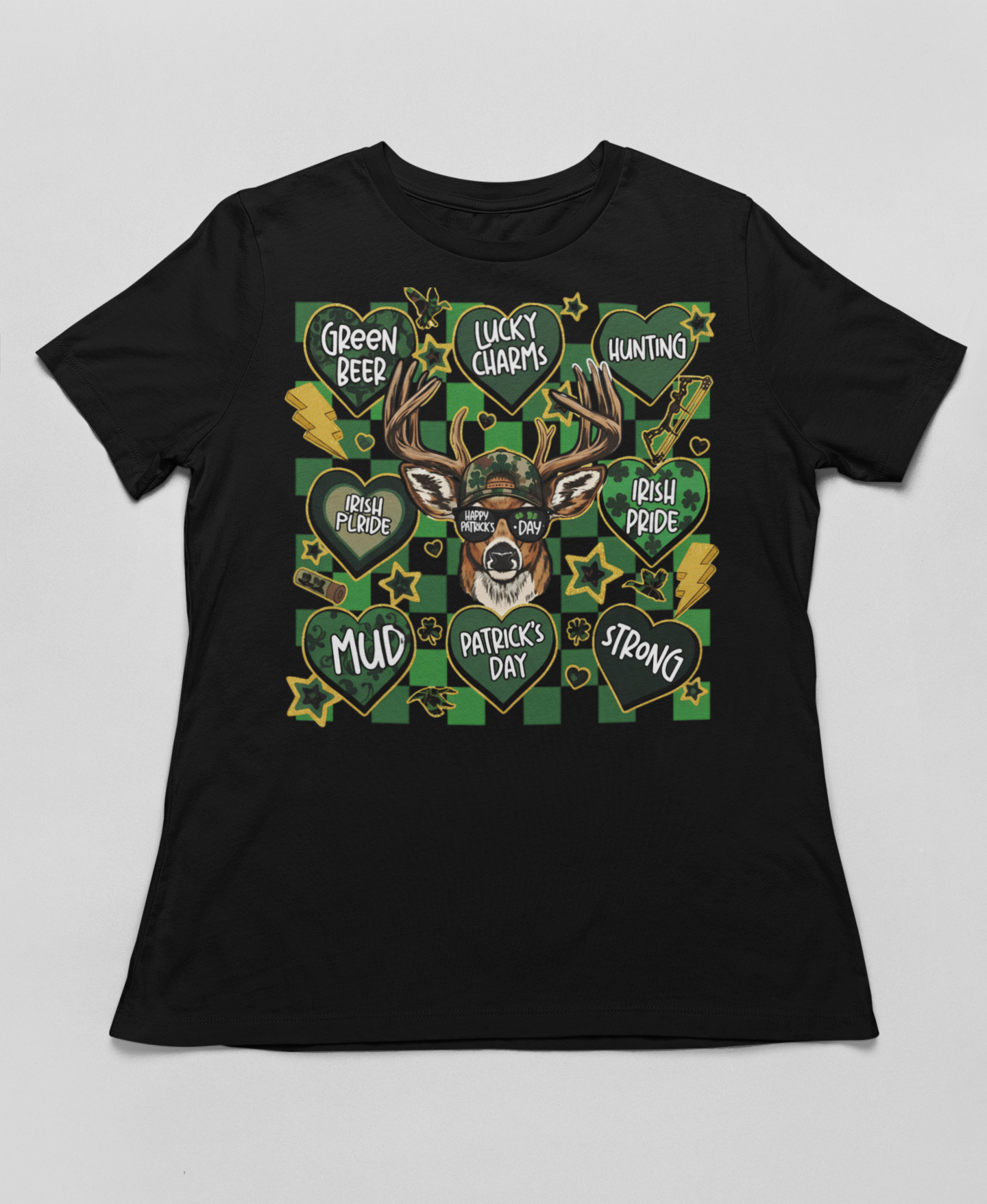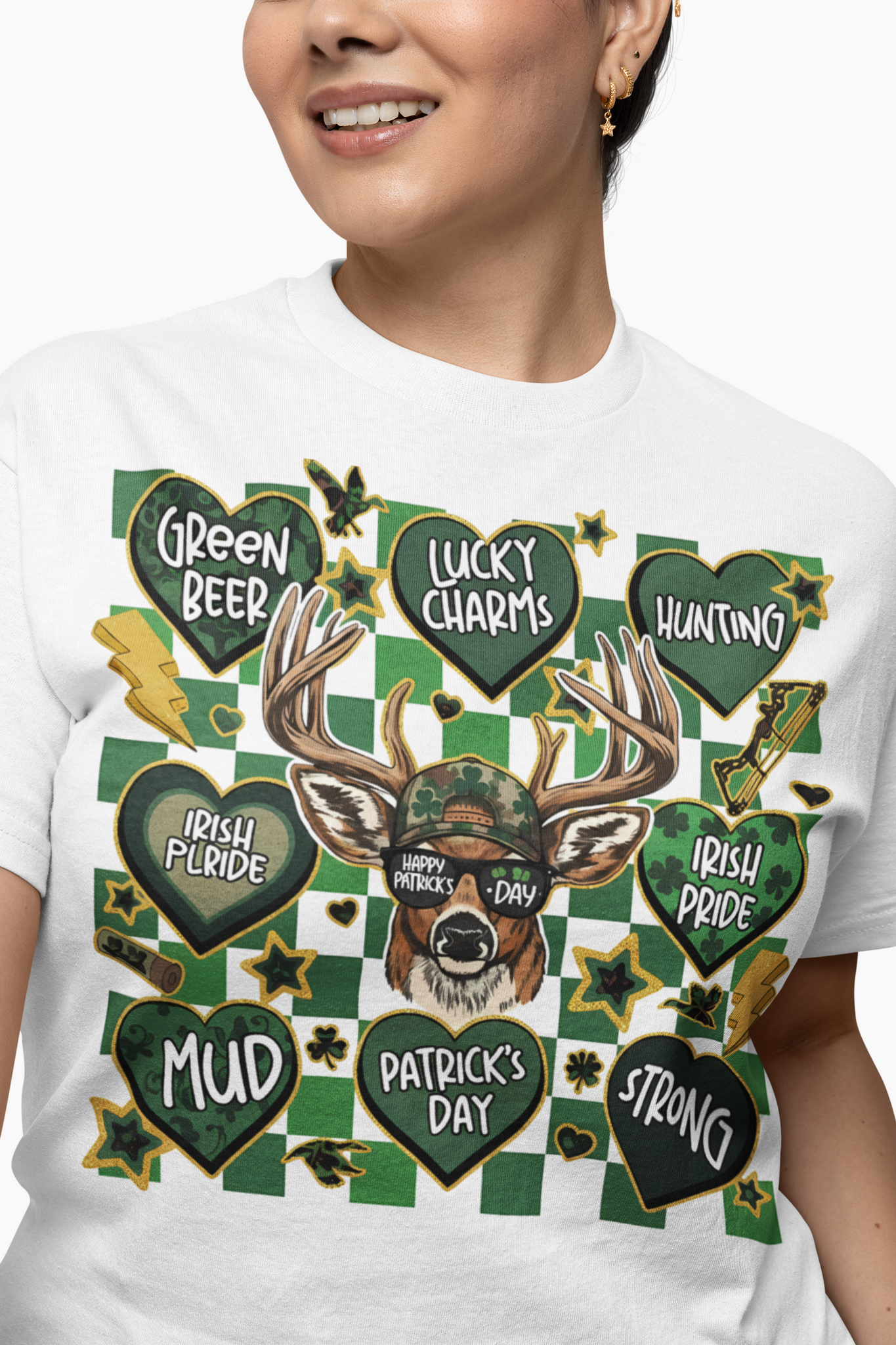 Celebrate everything St. Patrick's Day with our Multi-Heart deer tee! This unique design features a deer with "Happy Patrick's Day" sunglasses surrounded by 8 hearts: Green Beer, Lucky Charms, Hunting, Irish Pride, Mud, Patrick's Day, and Strong. Perfect for deer hunters who love Irish pride and good times!