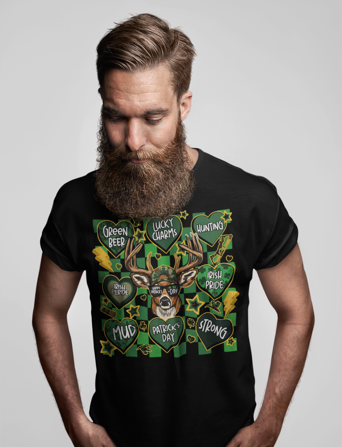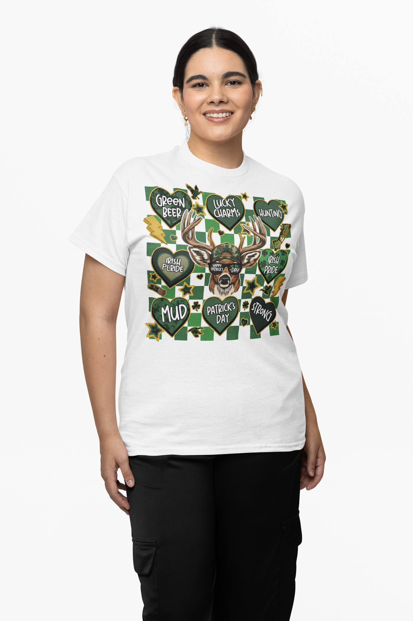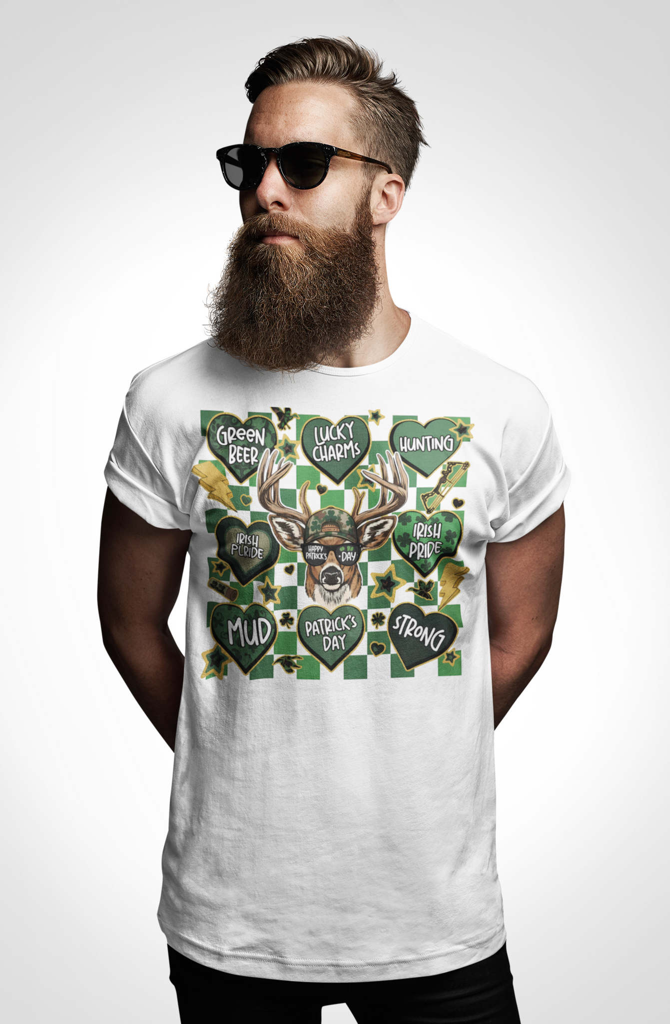 Celebrate everything St. Patrick's Day with our Multi-Heart deer tee! This unique design features a deer with "Happy Patrick's Day" sunglasses surrounded by 8 hearts: Green Beer, Lucky Charms, Hunting, Irish Pride, Mud, Patrick's Day, and Strong. Perfect for deer hunters who love Irish pride and good times!