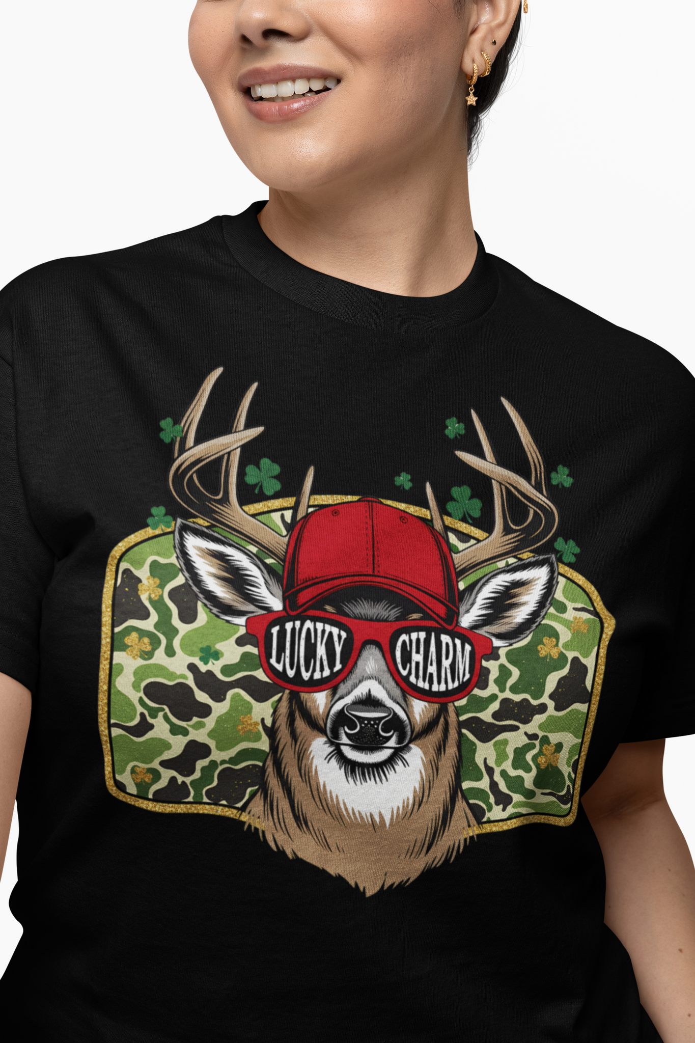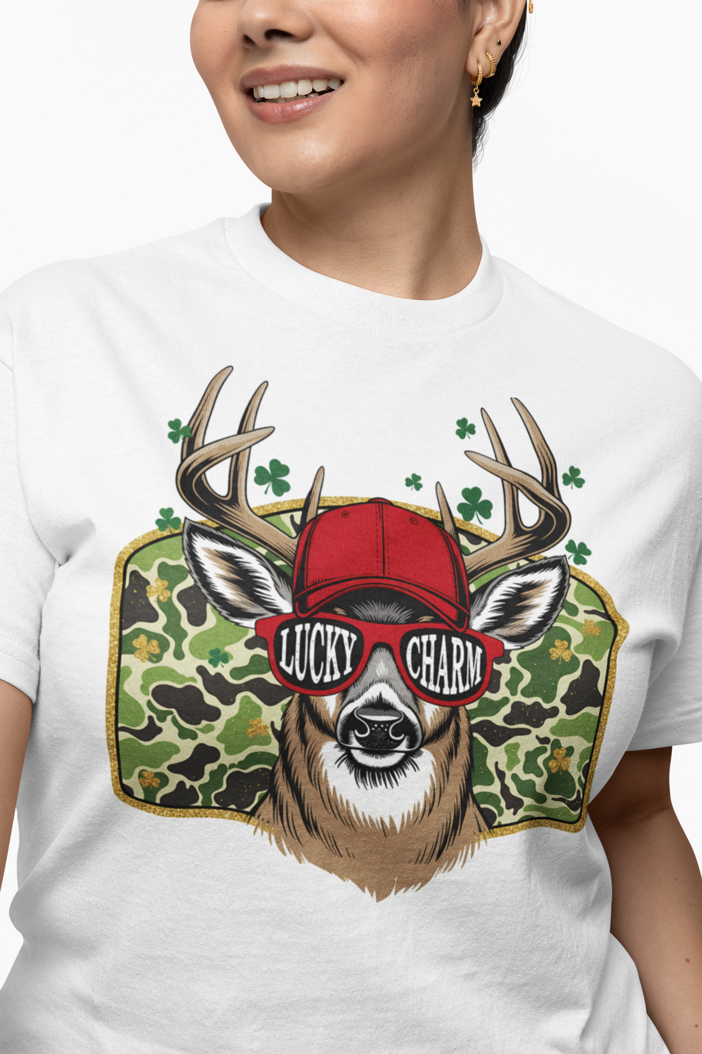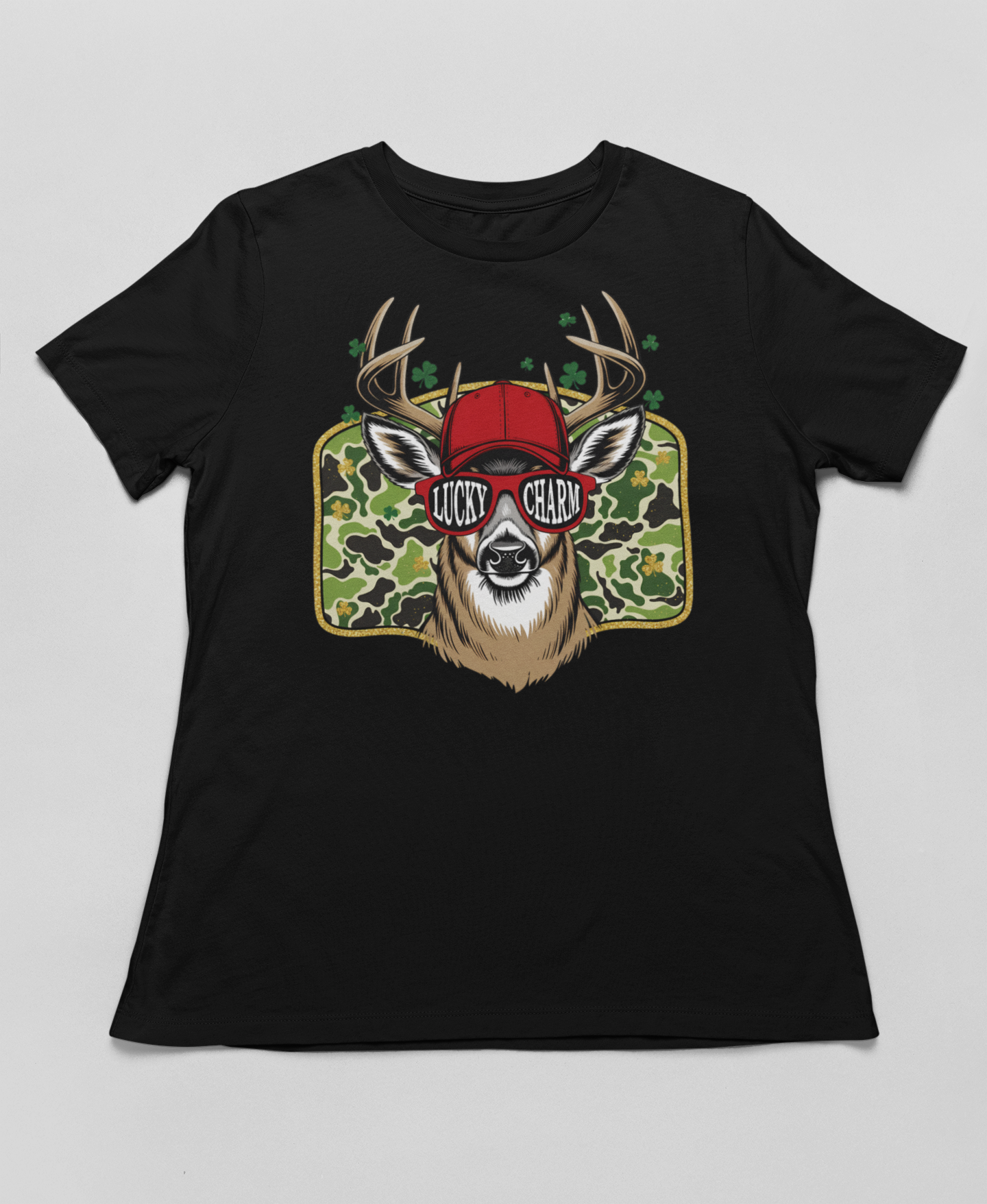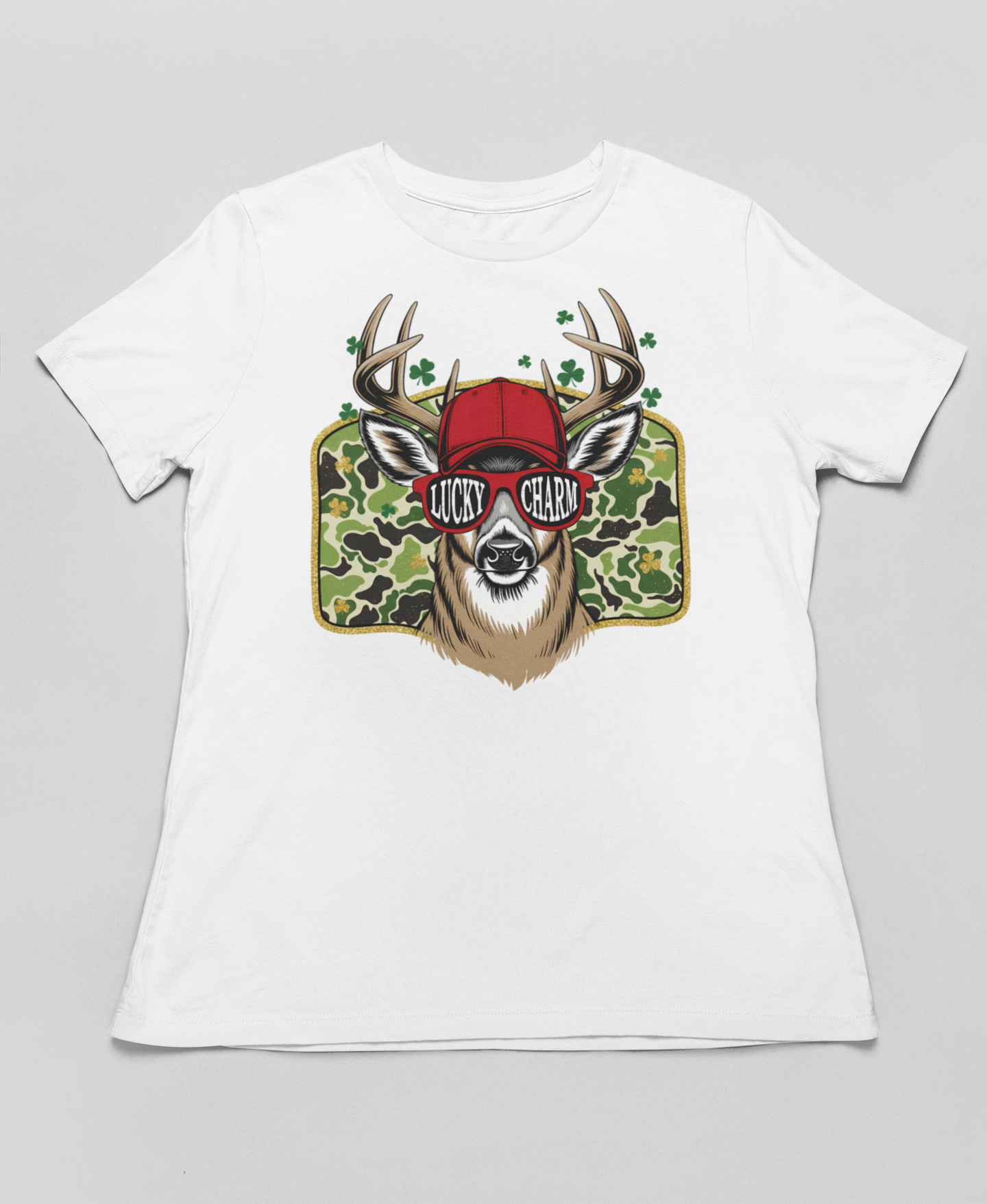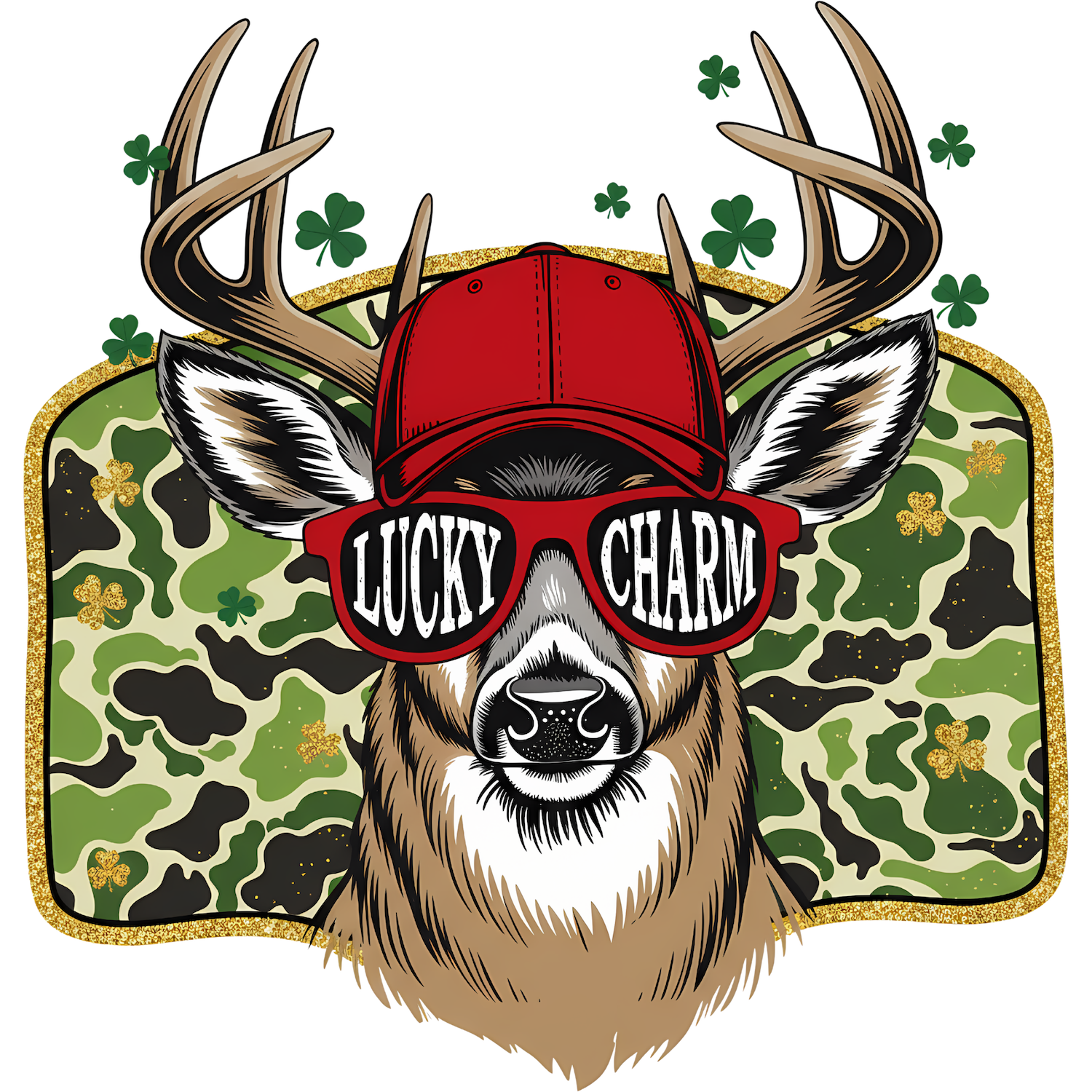 Stand out this St. Patrick's Day with our Lucky Charm Red Hat Edition! This eye-catching design features a deer with red baseball cap, red "Lucky Charm" sunglasses, and shamrock camo background. Perfect for deer hunters who love bold style and Irish pride.