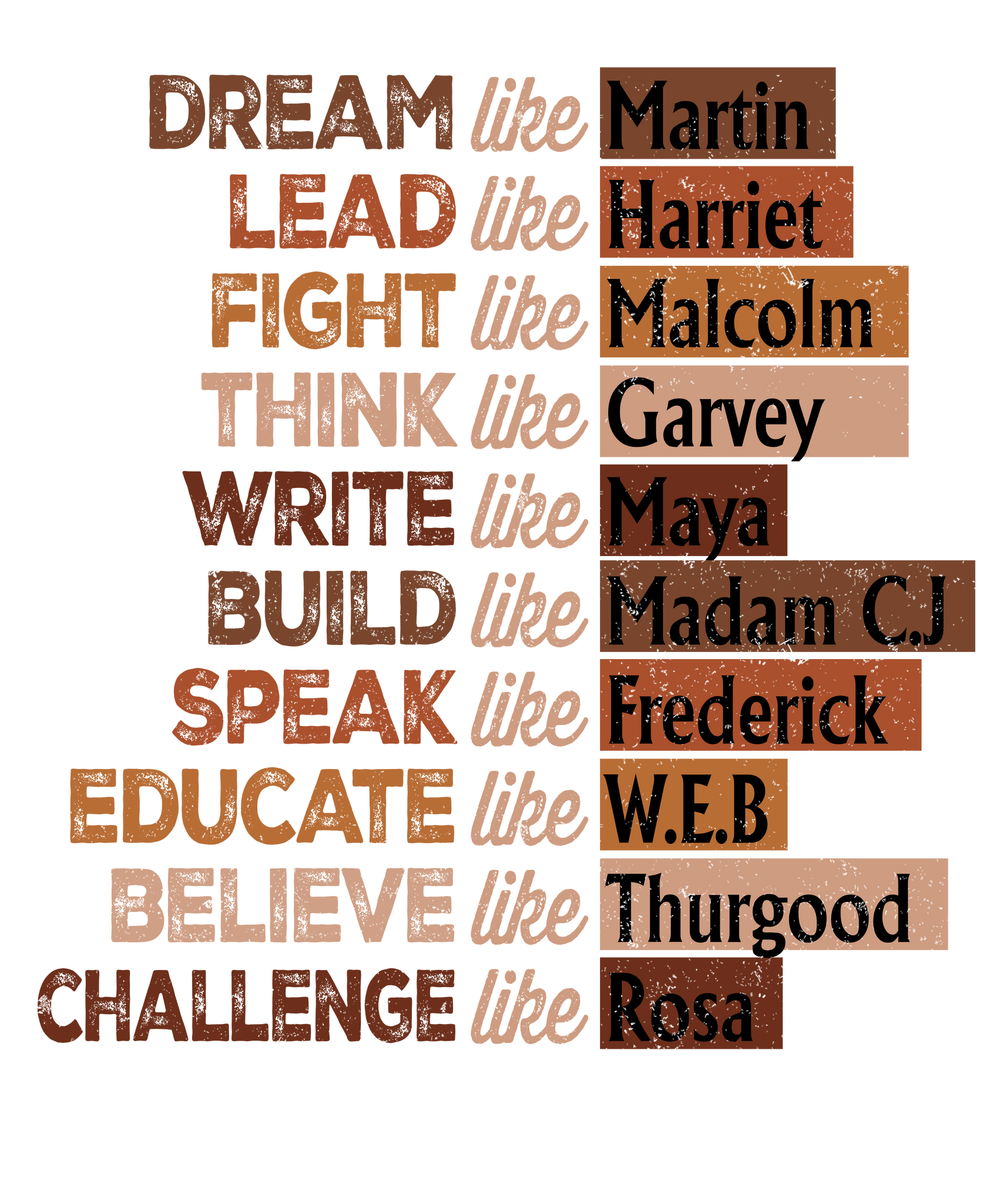 Dream Like Martin, Lead Like Harriet, Fight Like Malcolm, Think Like Garvey, Write Like Maya, Build Like Madam CJ, Speak Like Frederick, Educate Like W.E.B, Believe Like Thurgood, Challenge Like Rosa - A powerful call to action inspired by 10 legendary Black leaders.