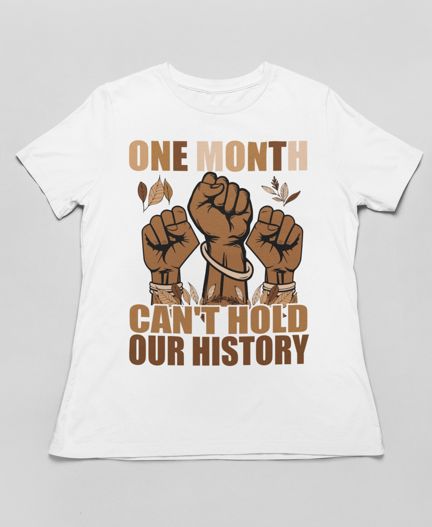This premium t-shirt features three raised fists in beautiful melanin shades, adorned with decorative leaves and natural elements. The bold typography declares that Black history, culture, and contributions span every month of the year, not just one.