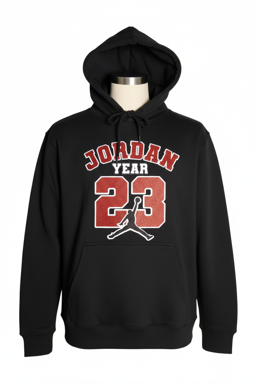 This exclusive commemorative hoodie celebrates Jordan's legendary 2023 year with premium multi-layered HTV vinyl and glitter details. A true statement piece that combines comfort with basketball heritage and custom craftsmanship.