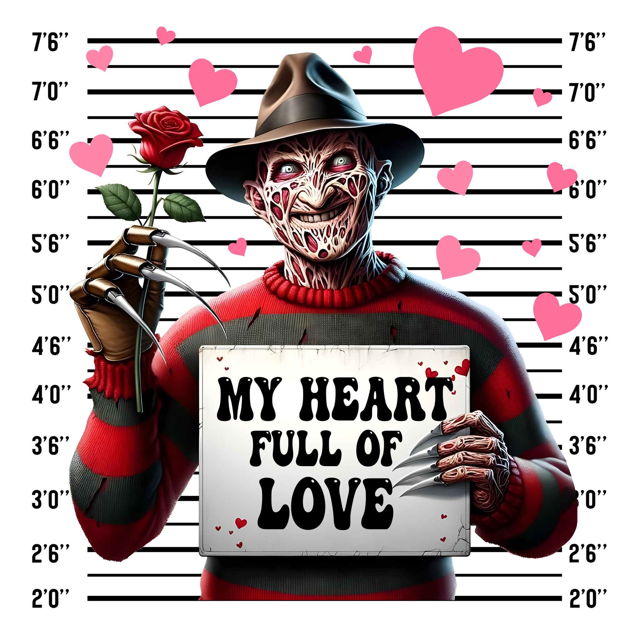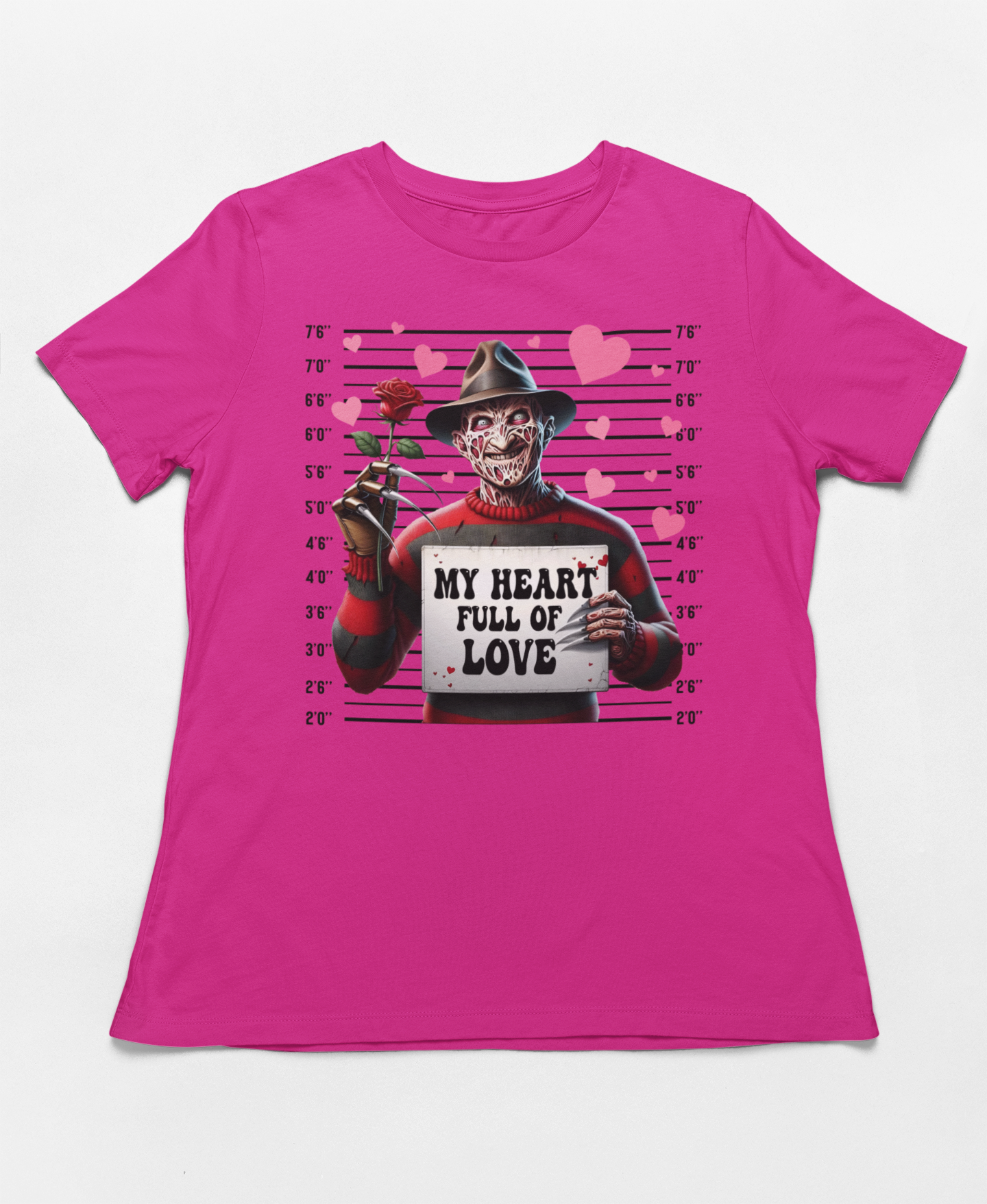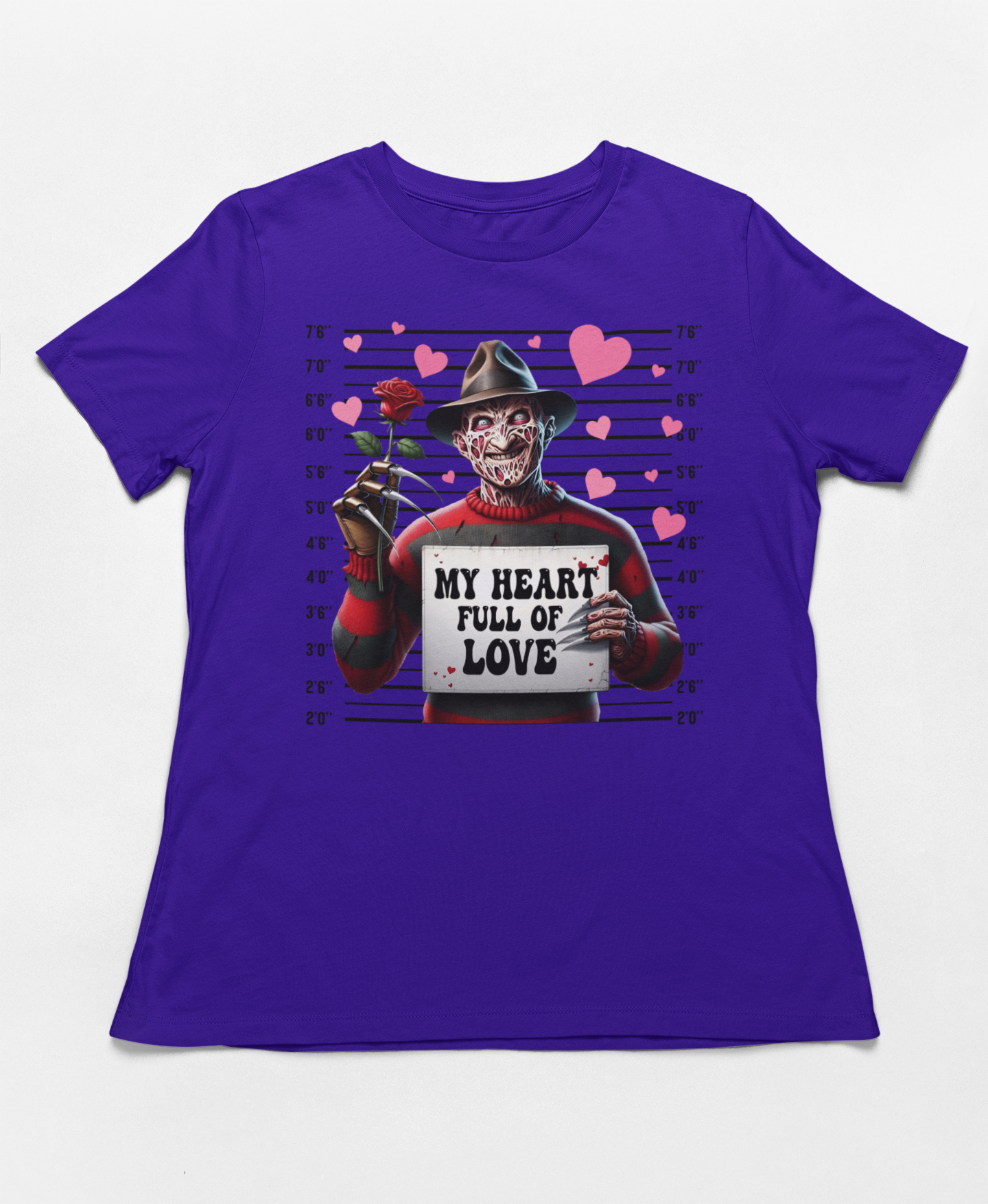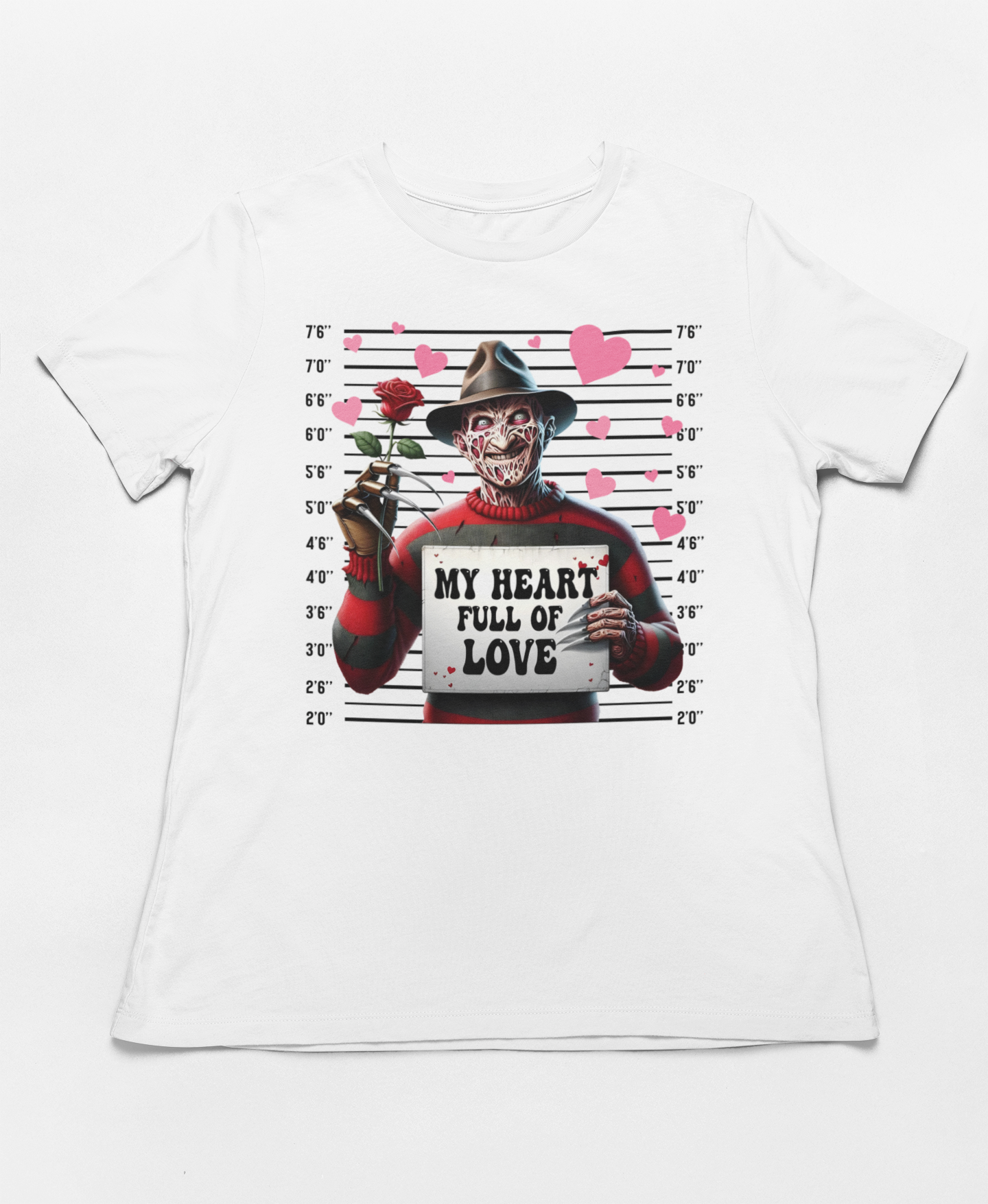 Looking for a Valentine's Day shirt with a killer sense of humor? This hilarious "My Heart Full of Love" Freddy Krueger mugshot design is perfect for horror fans who want to celebrate Valentine's Day with a playful twist! Whether you're celebrating Galentine's Day with your besties or just want to show off your love for horror, this shirt is guaranteed to turn heads.